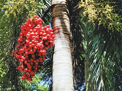 一株高大的狐尾椰上悬挂着一大串红色果实,好似一颗颗小灯笼。