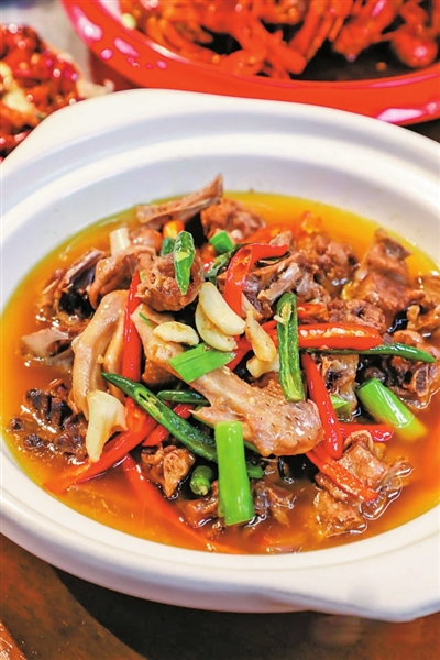 肉质紧实的青头鸭,先经过猛火爆炒,锅里的鸭肉在高温下迅速变色,锁住肉香。再加入秘制酱料,继续翻炒均匀后,倒入砂锅中慢炖,连骨头缝里都是新鲜的香。