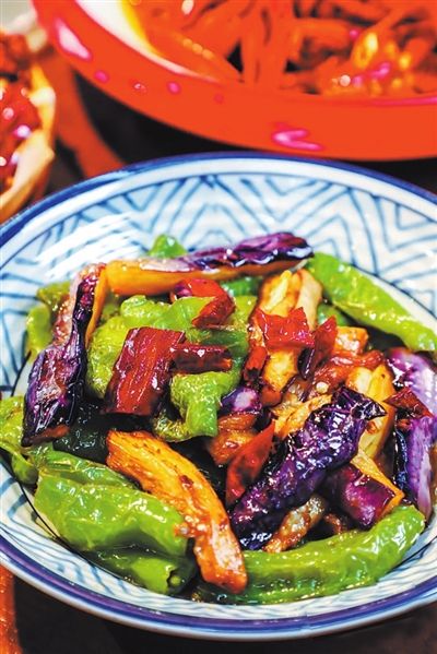 青椒被炸至外皮发皱,咬一口,多汁清甜,微微的辣意在舌尖散开;茄子放进锅里先炸后炒,软糯得像在嘴里“化开”,不太能吃辣的宝子也会爱上。