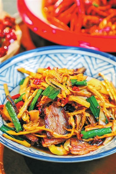 嫩绿的红薯叶火候拿捏得刚刚好,吃了满嘴辣菜后,来上一口,瞬间给味蕾“降降火”。