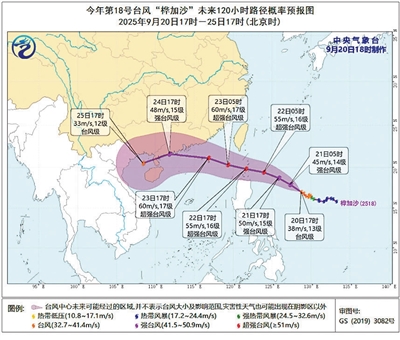 今年第18号台风“桦加沙”未来120小时(20日17时-25日17时)路径概率预报图。