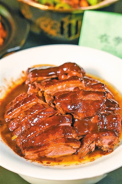 卤煮3小时,腐乳、海鲜酱等几十味调料渗入肌理,色泽红亮,肉质软烂。