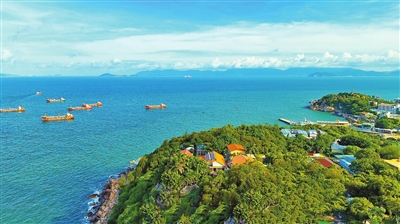 在远离陆地、风景优美的桂山岛,入目处树木葱茏、侧耳听浪吻崖石。登岛远眺,一艘艘航船迎着海风航行,增添无限生机与活力。