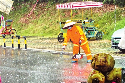 天空突降大雨,环卫工人依然坚守岗位,清理马路上的垃圾。 拍客:林集源 地点:淇澳岛淇沙湾 稿费:20元