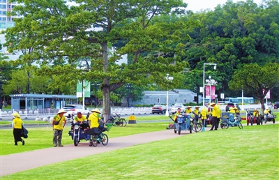 台风来临前,环卫工人齐心协力修整草坪和树枝,为防风做准备。