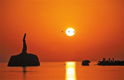 朝阳如赤金圆盘,悬于天际。“珠海渔女”似在凝望日出,身姿优雅。