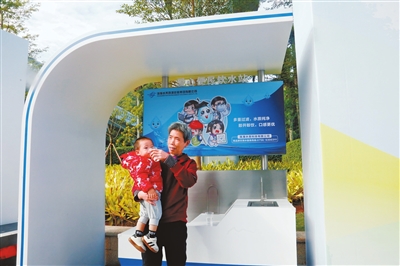 在大镜山公园游玩的市民饮用直饮水。本报记者 赵梓 摄