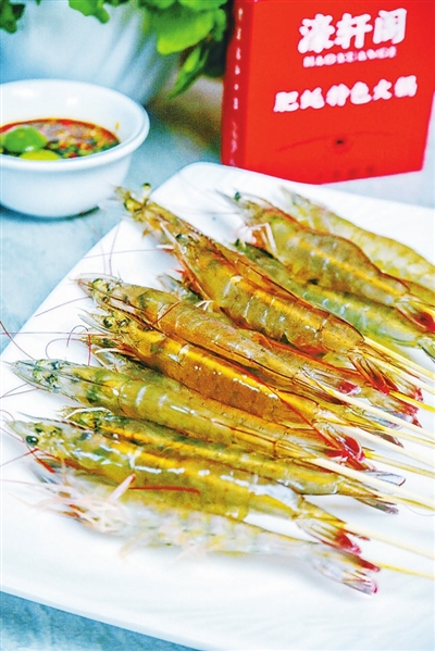新鲜活虾现穿成串,涮煮后Q弹紧实,一口一个鲜掉牙。