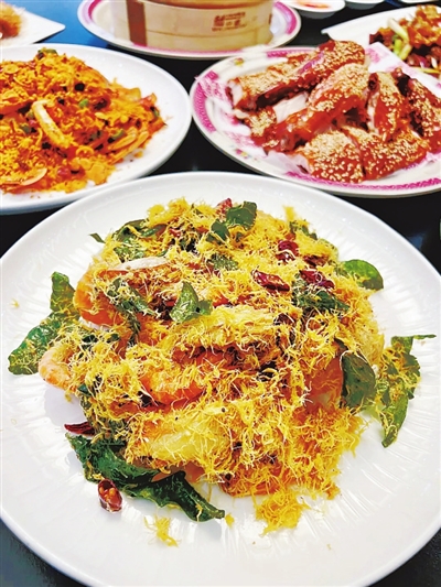金丝麦香虾更是惊艳味蕾的存在,选用的罗氏虾个个肥美饱满,虾壳裹着一层由鸡蛋、麦片、牛奶和椰丝调制的外衣。