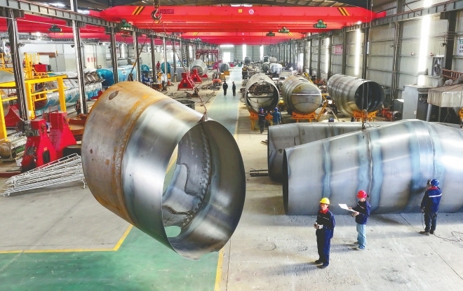 近日,在临城县光亚专用汽车生产车间,员工们在吊运粉尘物料车罐体部件。 近年来,临城县大力发展装备制造业,积极与科研机构和高校开展技术合作,形成以汽车制造、能源及环保设备等为核心的装备制造业特色,助力经济高质量发展。(邢台新闻传媒中心记者黄涛摄)