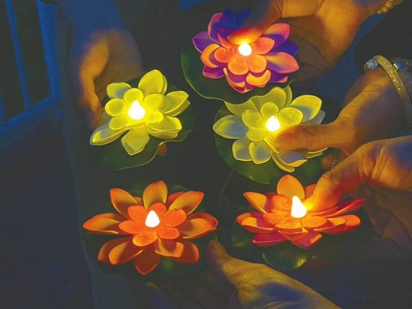 随着夜幕降临,活动迎来最动人的环节——携手放荷灯。河岸一侧,参与者们手持荷灯,轻轻放入七里河的柔波中。点点烛光映照水面,与星光交相辉映,传统仪式与现代浪漫在此刻完美融合。26岁的护士小王小心翼翼地将荷灯放入水中,目光追随着它缓缓漂远,微笑着说:“放荷灯的感觉很奇妙,仿佛心愿真的会随着流水实现。”
