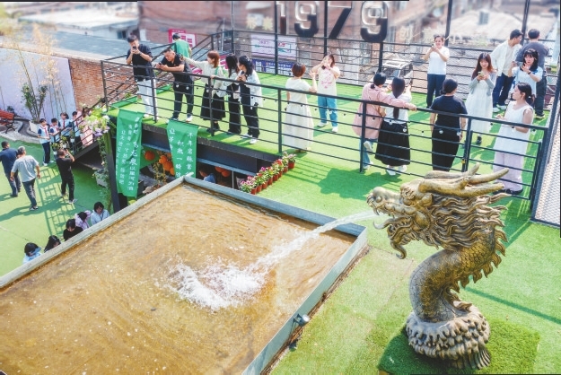 在飞龙泉“一飞冲天”的喷涌中,以甘泉轻点孩童额头,这种特有的仪式感,象征着沐龙恩,承福泽,寄托着祖辈的希望。看飞龙在空中喷水,听金桂在风中低语,预示龙门跃鲤、蟾宫折桂,交织成“最邢台”的成长寓意,福运绵长。