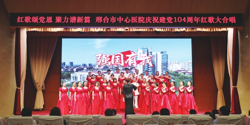 红歌大合唱活动中,来自全院各科室500余名党员和医务人员组成13支合唱队,倾情演唱《强国有我》《灯火里的中国》《祖国不会忘记》《走向复兴》等振奋人心的红色歌曲,用嘹亮歌声献礼党的生日。
