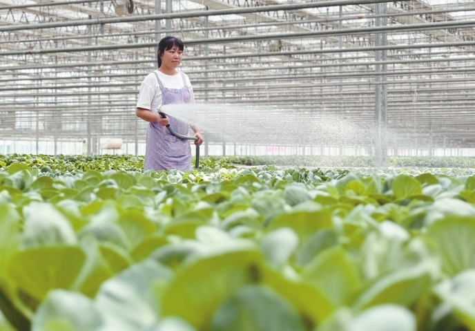 南和区贾宋镇寺上村的农民在设施蔬菜产业园内为蔬菜浇水。