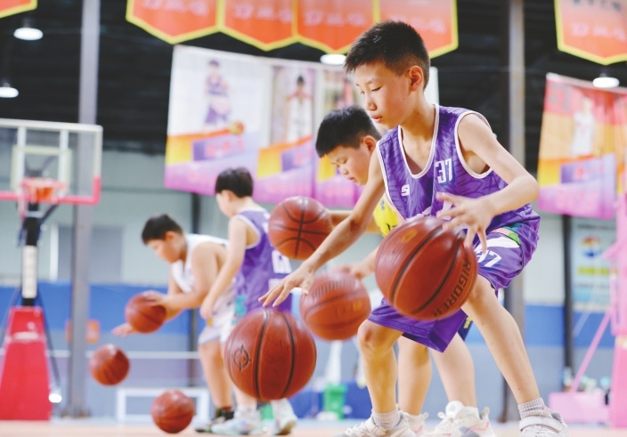 近日,小朋友们在广宗县一家运动馆内练习篮球。 暑期期间,我市各运动馆内热火朝天,中小学生积极参与篮球、羽毛球、田径等体育项目,在专业教练指导下提升技能、锻炼体魄。(记者 刘晓燕 通讯员 王垒摄)
