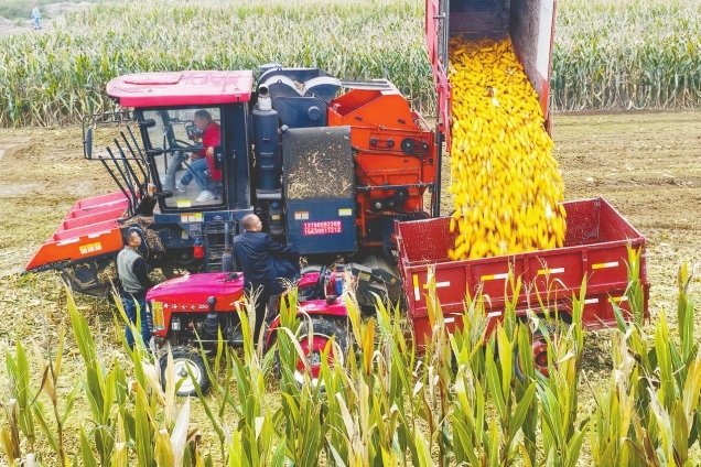 近日,内丘县统筹调配玉米收获机、烘干机等各类农机具,抢抓晴好天气,全力推进玉米收获、分拣、晾晒、烘干,力保颗粒归仓。图为内丘县大原村村民驾驶机械收获玉米。(霍红军 刘继东 摄)