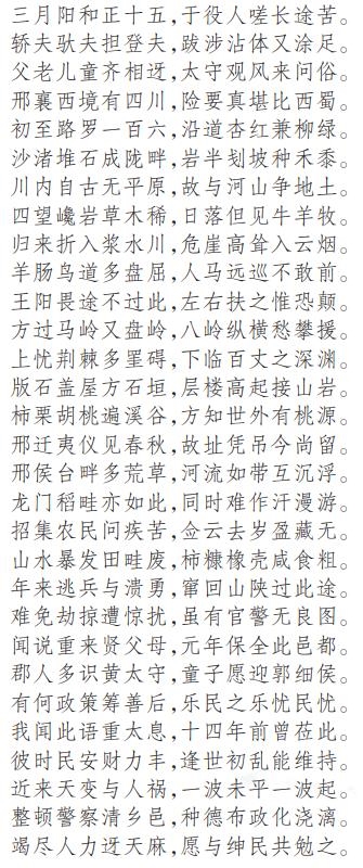 袁澍滋在诗中,详细描写了他在邢襄西部山区看到的“四川”险境堪比西蜀,以及百姓生活的疾苦。初到路罗川160华里,长途跋涉,轿夫叫苦,堆石成陇,岩坡种黍。再折入浆水川,危崖高耸、羊肠鸟道不敢前,过马岭又盘岭,方见柿栗遍溪谷、世外有桃源,在夷仪城、邢侯台遗址,凭吊慨然。听说龙门川、稻畦川也是如此,已是汗流浃背,走不过去了。于是,就在此处召集民众,询问民生疾苦。他了解到去年山洪暴发,农民吃柿糠橡壳,还有逃兵溃勇劫掠,人民生活困难,于是决定整顿警务,仁政爱民。