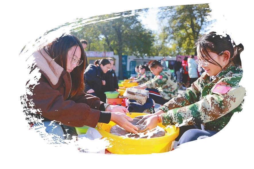 “说长街·聆听红色往事”中,深情的红色故事讲述与亲子才艺表演交织,使红色记忆在娓娓道来中焕发新生;“塑长街·重塑革命印记”手工坊内,家长与孩子共同制作质朴的泥碗,协力书写“百年育英才,亲子共成长”的毛笔字,于一捏一握、一撇一捺间,感悟艰苦奋斗的红色精神;“品长街·品味革命岁月”则成为一堂生动的实践课,亲子协作制作定胜糕、粗粮窝头、玉米饼子等,共同体会那段艰苦岁月,珍惜当下的幸福生活;“忆长街·追寻信仰之光”区域气氛热烈,绑腿、挑扁担、包扎、抬担架等一系列军事体能竞赛,家长和孩子在紧密配合中,深切感受到革命年代的团结意志与担当精神;作为收尾的“望长街·展望美好未来”环节,则通过科技制作与机器人拼搭等项目,将红色基因的传承与对未来科技的探索有机衔接,激励学生争做新时代好少年。