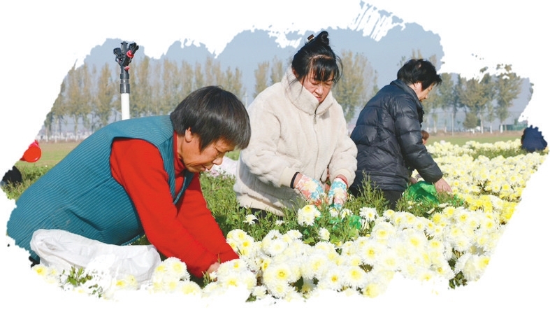 11月11日,宁晋县河渠镇内章村菊花种植基地,村民正在采收菊花。近年来,宁晋县优化农业种植结构,大力发展菊花、金银花等经济价值高、观赏性强的花草类中药材,拓宽农民增收渠道,助力乡村振兴。 (记者 张驰通讯员李策摄)