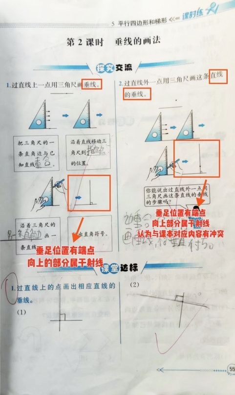 今年11月10日,就读于邢台市新华南路小学四年级(3)班的耿彦明,在完成《平行四边形和梯形》单元作业时,发现人教版数学教材配套的《课时练》里,第55页“垂线的画法”中所示插图与课本第57页关于“垂线”的定义及第58页“画垂线的步骤”图示不一致。按照教材,垂线为直线,而《课时练》图示中纵向线呈现为射线。