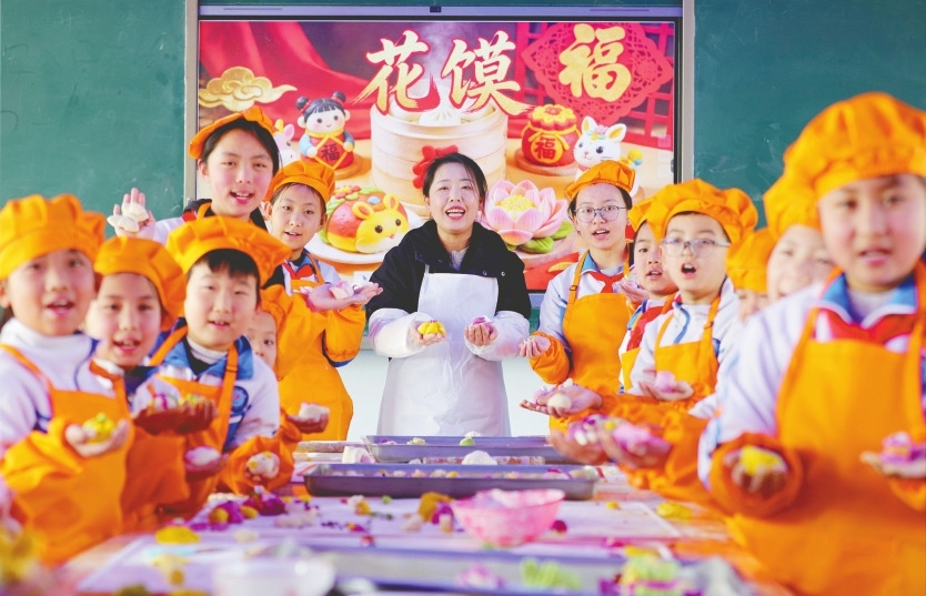 连日来,广宗县多所学校开展“多彩民俗迎新春”主题活动,师生们通过写春联、剪窗花、拓“马”迎福、蒸花馍等形式,亲身感受传统文化魅力,为即将到来的农历马年新春增添喜庆氛围。图为广宗县一所小学的师生展示制作好的花馍。 (记者 刘晓燕 通讯员 王垒摄)