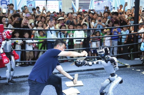 8月11日,在世界机器人大会展馆内,观众在宇树机器人展台观看机器人拳击展示。图/新华社