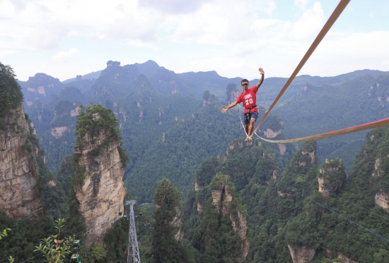 18日上午,2025张家界国家森林公园黄石寨景区“亚洲之王”千米高空扁带争霸赛开赛。图/通讯员吴勇兵