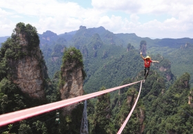 选手在张家界黄石寨景区景点师徒会和琵琶峰之间的扁带上表演绝活。图/通讯员吴勇兵