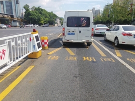 芙蓉路福元路口早晚高峰期间北往东左转车流量极大,原有车道配置难以满足通行需求,成为拥堵节点。此次设置的潮汐车道创新采用先进的“机器人式可移动护栏”技术,可根据交通流量变化,预计在早晚高峰期间(7:30—8:00,17:30—8:30),根据事实流量切换车道通行方向,增加北往东方向车道数量,有效缓解路口左转弯交通压力。