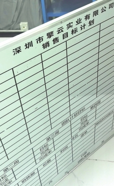 深圳中安公司此处办公地点,也出现了深圳擎云实业有限公司的影子。该公司玻璃门旁,放置一块白板,上面有“深圳擎云实业有限公司销售目标计划”字样。