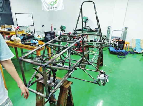 “发动机还在测试中,安装车身、轮胎后就可以跑了。”小郑表示,目前他们正在制作车座,整车在赛前可以完成。