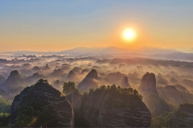 28日,怀化市通道侗族自治县万佛山景区,朝霞染红天际,丹霞峰林在云海中若隐若现,宛若仙山群岛。 文、图/通讯员石猛雷