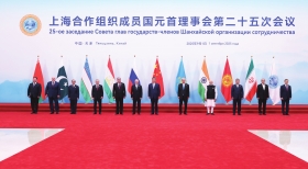 9月1日上午,上海合作组织成员国元首理事会第二十五次会议在天津梅江会展中心举行。中国国家主席习近平主持会议并发表题为《牢记初心使命开创美好未来》的重要讲话。这是习近平同出席会议的上海合作组织成员国领导人、常设机构负责人集体合影。图/新华社