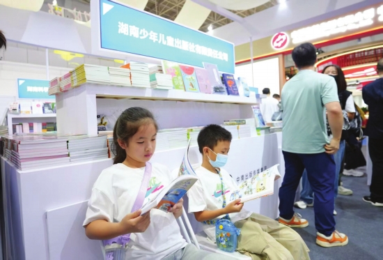 本届书展中南出版传媒集团展台前,读者络绎不绝,人流涌动。展位间的座椅上,数名小读者专注地翻阅着“大英儿童漫画百科”系列、“神探迈克狐”系列和“悦科普”书系,沉浸于知识与故事的世界里;孩子身旁的家长们也手不释卷,轻声翻阅《亲爱的人们》《孤勇:左宗棠新传》《长安的荔枝》等书籍。
