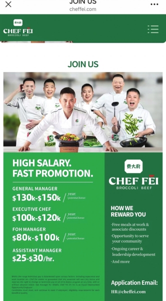 记者注意到,在此官网招聘页面,费大厨辣椒炒肉打出“高薪资、快晋升”的宣传,其中门店店长一职的年薪为13万至15万美元,约合人民币93万至107万元,此外还包含绩效奖金。