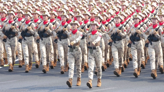 民兵方队全部由女民兵组成。这是民兵首次亮相以纪念抗战胜利为主题的阅兵活动。民兵是中国“三结合”武装力量的重要组成部分。抗日战争中,广大民兵为抗战胜利作出了不可磨灭的贡献,谱写了人民战争的不朽篇章。
