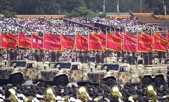 接受检阅的80面战旗,从全军各部队遴选确定,来自东、南、西、北、中五大战区,涵盖陆、海、空军和武警部队,由团、营、连三级功勋荣誉单位代表组成。