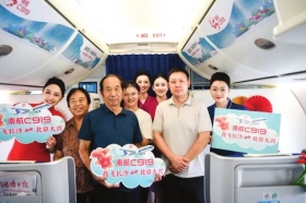 “这是南航C919首次执飞长沙—北京大兴航线,欢迎乘机。”在9月9日CZ3717航班上,乘务组手持主题欢迎牌在舱门迎接旅客。