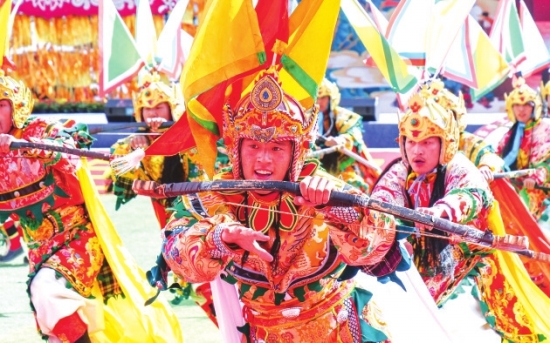 9月15日,类乌齐县群众表演非物质文化遗产岭卓舞。9月15日,第十一届三江茶马文化艺术节在西藏昌都市拉开帷幕。据悉,为期3天的艺术节将开展一系列丰富多彩的活动,全景式展现昌都独特的历史文化、民族风情和时代风采。图/新华社