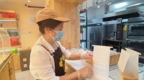 17岁初中毕业的李明(化名)也在蒋女士的面包店工作,每当有顾客来时,他就会大声问好,简单介绍面包品种、口味,并开票装袋。