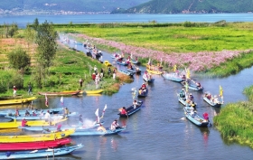 9月16日,当地群众驾着猪槽船从泸沽湖的洛洼北码头开始转海。 9月16日,2025年四川省凉山州首届泸沽湖转山转海节开幕。转山转海是居住在泸沽湖附近摩梭人的重要民俗。从今年开始,四川省凉山州将每年农历七月二十五日正式设立为“泸沽湖转山转海节”,并纳入地方法定节日,盐源、木里两县群众可享受一天专属假期。图/新华社