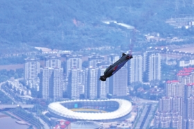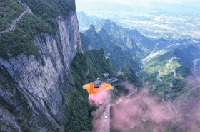 9月16日,张家界天门山景区,翼装飞行运动员比赛现场。