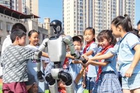 16日,永州市冷水滩区梅湾小学,孩子们在和人形机器人互动。近期,永州市组织开展机器人进校园活动,让孩子们近距离感受人工智能的魅力,激发他们对科学探索的热情。图/通讯员雷中祥