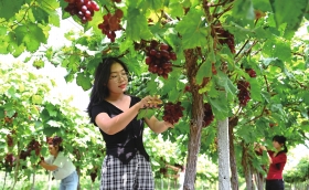 9月22日,邵阳市绥宁县东山侗族乡牛背龄村的村民在采摘红提葡萄。秋分至,当地农民紧抓农时开展抢收稻谷、采摘果实等农事作业,田间地头一派金秋丰收的农忙景象。