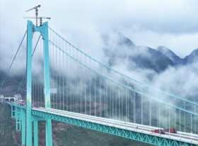 经过三年多建设,新的世界第一高桥——贵州花江峡谷大桥于9月28日正式建成通车。花江峡谷大桥是贵州六枝至安龙高速公路的控制性工程,大桥全长2890米,主跨1420米,是目前世界山区峡谷第一大跨度钢桁梁悬索桥;其桥面距水面垂直高度625米,超越北盘江第一桥成为新的“世界第一高桥”。图/新华社
