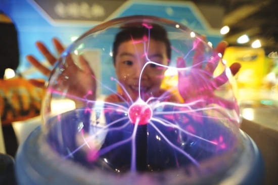 10月3日,小朋友在江苏扬州科技馆体验“辉光球”。国庆中秋假期,人们走出家门,悦享假日时光。图/新华社