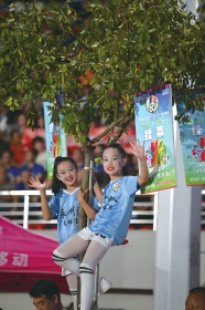 9月27日晚,永州,湘超热场演出中,小演员表演“挂票”。图/记者吴琳红