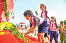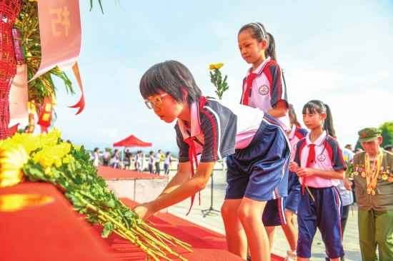 9月30日,永州市道县陈树湘红色文化园,学生向烈士纪念碑敬献鲜花。图/视觉中国