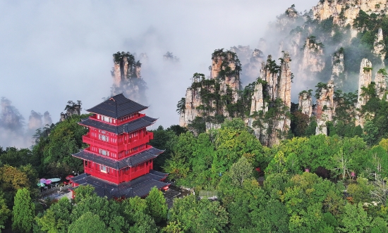 9月30日,雨后放晴的张家界国家森林公园天子山、黄石寨、鹞子寨出现大面积云海。 图/视觉中国