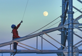 10月6日,在衡阳市雁峰区,高塔架线工人在月光的映射下施工。月满中秋,家国同圆。在祖国各地,人们同赏明月、共度佳节。图/新华社